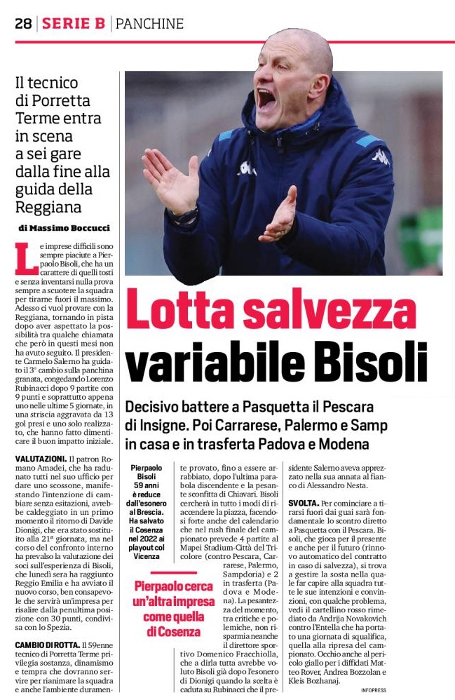 Le imprese difficili sono sempre piaciute a Pierpaolo Bisoli, che ha un carattere di quelli tosti e senza inventarsi nulla prova sempre a scuotere la squadra per tirarne fuori il massimo. Adesso ci vuol provare con la Reggiana, tornando in pista dopo aver aspettato la possibilità tra qualche chiamata che però in questi mesi non ha avuto seguito. Il presidente Carmelo Salerno ha guidato il 3° cambio sulla panchina granata, congedando Lorenzo Rubinacci dopo 9 partite con 9 punti e soprattutto appena uno nelle ultime 5 giornate, in una striscia aggravata da 13 gol presi e uno solo realizzato, che hanno fatto dimenticare il buon impatto iniziale.