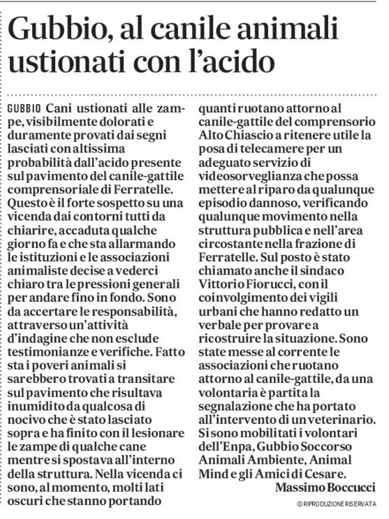 GUBBIO Cani ustionati alle zampe, visibilmente doloranti e duramente provati dai segni lasciati con altissima probabilità dall’acido presente sul pavimento del canile-gattile comprensoriale di Ferratelle. Questo è il forte sospetto su una vicenda dai contorni tutti da chiarire, accaduta qualche giorno fa e che sta allarmando le istituzioni e le associazioni animaliste decise a vederci chiaro tra le pressioni generali per andare fino in fondo. Sono da accertare le responsabilità, attraverso un’attività d’indagine che non esclude testimonianze e verifiche in ordine sparso. Fatto sta i poveri animali si sarebbero trovati a transitare sul pavimento che risultava inumidito da qualcosa di nocivo che è stato lasciato sopra e ha finito con il lesionare le zampe di qualche cane mentre si spostava all’interno della struttura. Nella vicenda ci sono, al momento, molti lati oscuri che stanno portando quanti ruotano attorno al canile-gattile del comprensorio Alto Chiascio a ritenere utile la posa di telecamere per un adeguato servizio di videosorveglianza che possa mettere al riparo da qualunque episodio dannoso per il benessere e l’accoglienza degli animali, verificando qualunque movimento nella struttura pubblica e nell’area circostante nella frazione di Ferratelle. Sul posto, nel segnalare l’accaduto, è stato chiamato anche il sindaco Vittorio Fiorucci, con il coinvolgimento dei vigili urbani che hanno redatto un verbale per provare a ricostruire la situazione. Sono state messe al corrente le associazioni di volontariato che ruotano attorno al canile-gattile e proprio da una volontaria è partita la segnalazione che ha portato a richiedere subito l’intervento di un medico veterinario e quindi a livelli istituzionale. Si sono mobilitate, con sollecitazioni per migliorare le condizioni di cani e gatti, i volontari dell’Enpa (Ente nazionale protezione animali), Gubbio Soccorso Animali Ambiente, Animal Mind e gli Amici di Cesare.