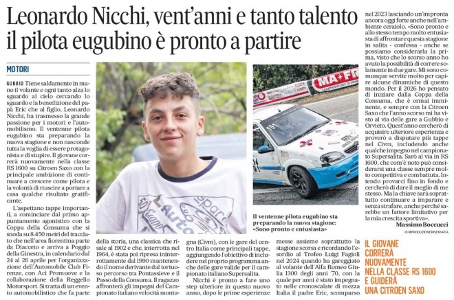 GUBBIO Tiene saldamente in mano il volante e ogni tanto alza lo sguardo al cielo cercando lo sguardo e la benedizione del papà Eric che al figlio, Leonardo Nicchi, ha trasmesso la grande passione per i motori e l’automobilismo. Il ventenne pilota eugubino sta preparando la nuova stagione e non nasconde tutta la voglia di essere protagonista e di stupire. Il giovane correrà nuovamente nella classe RS 1600 su Citroen Saxo con la principale ambizione di continuare a crescere come pilota e la volontà di riuscire a portare a casa qualche risultato gratificante.