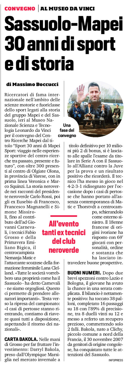 Ricercatori di fama internazionale nell’ambito delle scienze motorie e fuoriclasse dello sport legati alla storia del gruppo Mapei e del Sassuolo, ieri al Museo Nazionale Scienza e Tecnologia Leonardo da Vinci per il convegno del Centro Ricerche Mapei dal titolo “Sport 30 anni di Mapei Sport: viaggio nelle esperienze sportive del centro ricerche tra passato, presente e futuro”, con oltre 300 presenti al centro di Olgiate Olona, in provincia di Varese, con in prima linea Veronica e Marco Squinzi. La storia neroverde nei racconti del presidente neroverde Carlo Rossi, poi gli ex Eusebio di Francesco, Francesco Magnanelli e Simone Missiroli, fino al contributo dell’ad Giovanni Carnevali, i tecnici Fabio Grosso e della Primavera Emiliano Bigica, il centrocampista Nemanja Matic e l’attaccante scozzese della formazione femminile Lana Clelland. «Tutte le società vorrebbero una proprietà come ha il Sassuolo – ha detto Carnevali – ne siamo orgogliosi. Questo ci permette di prendere allenatori importanti». Testa verso la ripresa del campionato: «I casi di pertosse stanno rientrando, contiamo di riavere quasi tutti a disposizione, aspettando il ritorno dei nazionali».