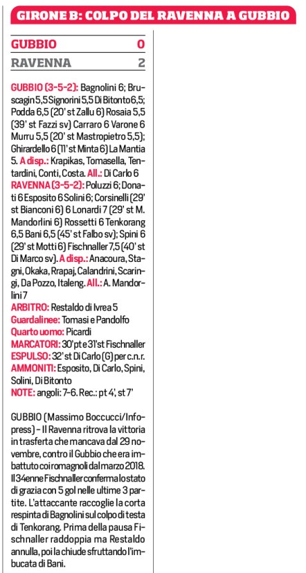 RAVENNA (3-5-2): Poluzzi 6; Donati 6 Esposito 6 Solini 6; Corsinelli (29’ st Bianconi 6) 6 Lonardi 7 (29’ st M. Mandorlini 6) Rossetti 6 Tenkorang 6,5 Bani 6,5 (45’ st Falbo sv); Spini 6 (29’ st Motti 6) Fischnaller 7,5 (40’ st Di Marco sv). A disp.: Anacoura, Stagni, Okaka, Rrapaj, Calandrini, Scaringi, Da Pozzo, Italeng. All.: A. Mandorlini 7