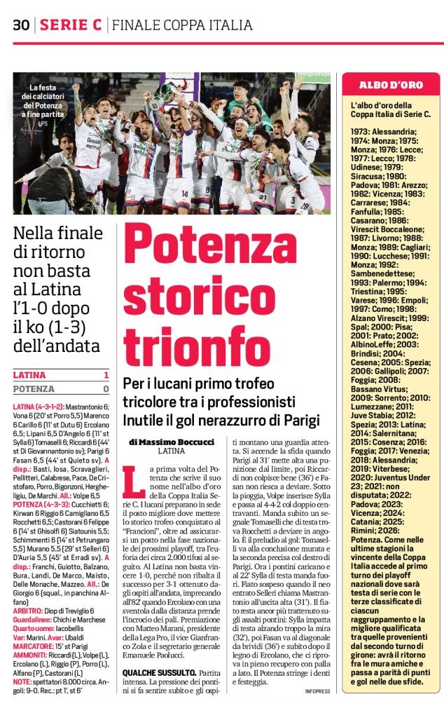 La prima volta del Potenza che scrive il suo nome nell’albo d’oro della Coppa Italia Serie C. I lucani preparano in sede il posto migliore dove mettere lo storico trofeo conquistato al “Francioni”, oltre ad assicurarsi un posto nella fase nazionale dei prossimi playoff, tra l’euforia dei circa 2.000 tifosi al seguito. Al Latina non basta vincere 1-0, perché non ribalta il successo per 3-1 ottenuto dagli ospiti all’andata, imprecando all’82’ quando Ercolano con una sventola dalla distanza prende l’incrocio dei pali. Premiazione con Matteo Marani, presidente della Lega Pro, il vice Gianfranco Zola e il segretario generale Emanuele Paolucci.