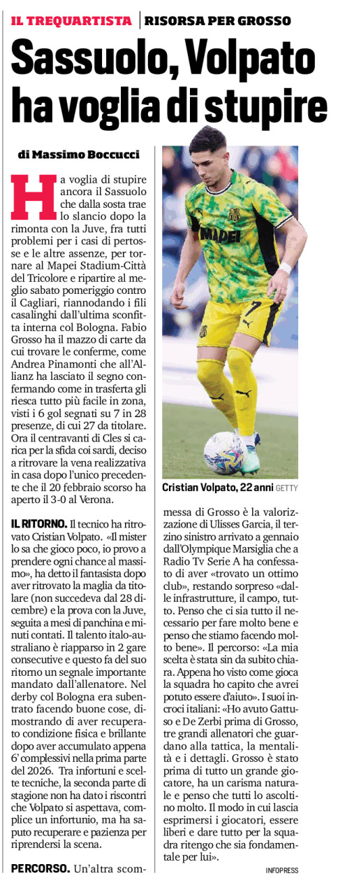 IL RITORNO. Il tecnico ha ritrovato Cristian Volpato. «Il mister lo sa che gioco poco, io provo a prendere ogni chance al massimo», ha detto il fantasista dopo aver ritrovato la maglia da titolare (non succedeva dal 28 dicembre) e la prova con la Juve, seguita a mesi di panchina e minuti contati. Il talento italo-australiano è riapparso in 2 gare consecutive e questo fa del suo ritorno un segnale importante mandato dall’allenatore. Nel derby col Bologna era subentrato facendo buone cose, dimostrando di aver recuperato condizione fisica e brillante dopo aver accumulato appena 6’ complessivi nella prima parte del 2026. Tra infortuni e scelte tecniche, la seconda parte di stagione non ha dato i riscontri che Volpato si aspettava, complice un infortunio, ma ha saputo recuperare e pazienza per riprendersi la scena.