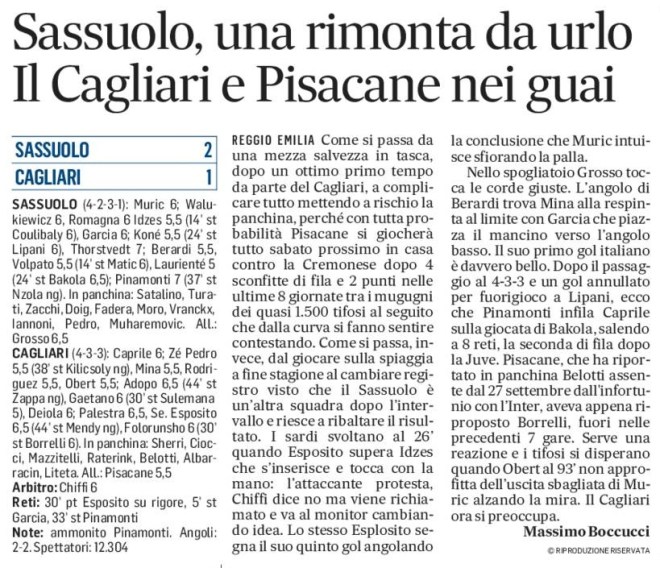 Nello spogliatoio Grosso tocca le corde giuste. L’angolo di Berardi trova Mina alla respinta al limite con Garcia che piazza il mancino verso l’angolo basso. Il suo primo gol italiano è davvero bello. Dopo il passaggio al 4-3-3 e un gol annullato per fuorigioco a Lipani, ecco che Pinamonti infila Caprile sulla giocata di Bakola, salendo a 8 reti, la seconda di fila dopo la Juve. Pisacane, che ha riportato in panchina Belotti assente dal 27 settembre dall’infortunio con l’Inter, aveva appena riproposto Borrelli, fuori nelle precedenti 7 gare. Serve una reazione e i tifosi si disperano quando Obert al 93’ non approfitta dell’uscita sbagliata di Muric alzando la mira. Il Cagliari ora si preoccupa.