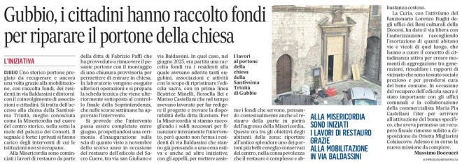 GUBBIO Uno storico portone pregiato da recuperare e ancora una volta grazie alla mobilitazione, con raccolta fondi, dei residenti in via Baldassini e dintorni con il coinvolgimento di associazioni e cittadini. Si tratta dell’accesso alla chiesa della Santissima Trinità, meglio conosciuta come la Misericordia nel cuore del centro storico, nella sotto la mole del palazzo dei Consoli. Il segnale è forte: i privati si fanno carico degli interventi di cui le istituzioni non si occupano.