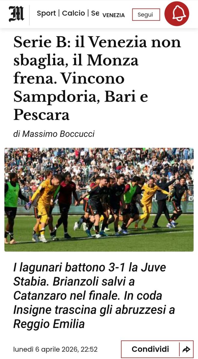 Risponde al Frosinone e al Palermo, così il Venezia batte la Juve Stabia e nella 33ª giornata prosegue la corsa in vetta, mentre frena il Monza nel finale riacciuffa il Catanzaro per un pareggio che giova ai ciociari e ai lagunari. La squadra di Giovanni Stroppa conquista la 5ª vittoria interna consecutiva grazie all’autogol di Giorgini e alla doppietta di Adorante, che nella ripresa sbaglia un rigore. I brianzoli ora sono scesi a -5 dalla vetta dopo l’1-1 al Ceravolo. Calabresi avanti con il colpo di Pontisso, bravo a rubare palla a un disattento Ciurria in piena area. Poi, nervi a fior di pelle: rosso ad Alesi per il gioco pericoloso su Ravanelli, Cutrone con il 2° giallo preso per un pestone ad Antonini e Keita dopo una reazione scomposta su Cassandro. Nel finale Antonini trattiene Petagna ed è rigore per il Monza che Pessina trasforma.