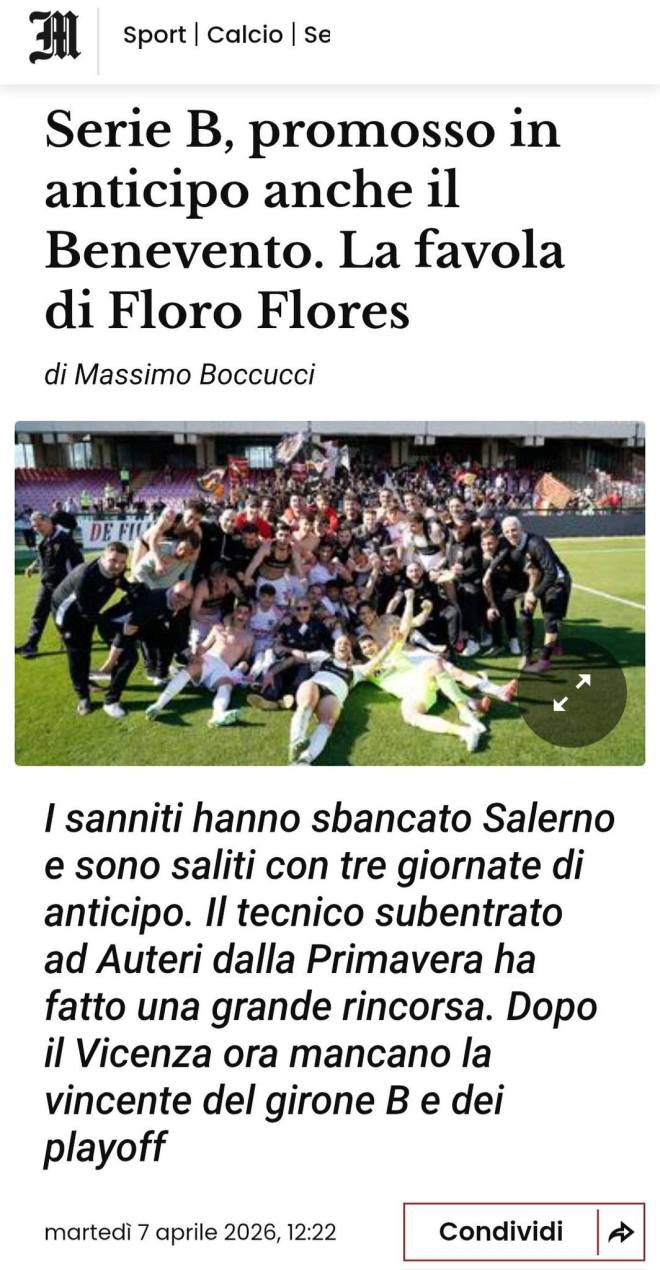Floro Flores, 42 anni, ex attaccante di Napoli, Udinese e Sassuolo tra le altre, è stato chiamato dal Benevento a guidare l’Under 17 nell’estate 2024 e poi promosso in Primavera, fino all’11 novembre scorso quando gli è stata affidata la prima squadra dopo l’esonero di Gaetano Auteri. In quel momento i sanniti erano terzi in classifica a 2 punti dal Catania capolista. Ha esordito battendo 3-1 il Monopoli per salire al 2° posto e il 5 gennaio, dopo la vittoria contro il Crotone, balzato al comando da solo scavalcando i siciliani. Da quel momento la corsa verso la B è stata praticamente inarrestabile. Il 2-1 al Catania del 5 marzo ha scritto il finale della storia con largo anticipo, il blitz in casa della Salernitana (già travolta all’andata) ha dato il via libera ai festeggiamenti.