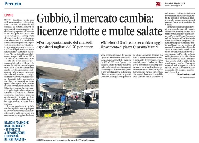 GUBBIO Cambiano molte cose nell’organizzazione del tradizionale mercato settimanale del martedì. La Giunta Fiorucci ha approvato il nuovo regolamento che è stato proposto dall’assessore allo Sviluppo Economico, Micaela Parlagreco, e verrà portato all’attenzione del consiglio comunale a fine mese. Si tratta delle linee di indirizzo operativo che prevedono importanti novità rispetto al regolamento in vigore da oltre 15 anni. Il primo elemento caratterizzante è contenuto nell’articolo 7, in cui si stabilisce che le licenze vengano ridotte da 123 a 101, cioè del 20 per cento, a causa del fatto che alcuni espositori sono deceduti e gli eredi hanno dismesso le attività, ma anche perché ci sono commercianti non in regola con il pagamento della licenza e della successiva sanatoria e che nel prossimo consiglio comunale si proporrà di dichiarare decaduti dalla concessione pubblica con la questione in sospeso del recupero delle spettanze e del loro inquadramento nel bilancio comunale. Le concessioni singole degli ambulanti passeranno da una validità di 12 a 10 anni. Saranno registrate le presenze degli espositori tramite un doppio controllo giornaliero da parte dei vigili urbani, a inizio e fine mattina.