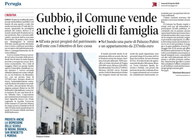 GUBBIO Si apre la vendita del patrimonio immobiliare pubblico nel bando di asta aperto a tutti che mette sul mercato 27 lotti del Comune, spaziando da prestigiosi palazzi del centro storico a ex scuole rurali nelle frazioni sul vasto territorio, fino a terreni edificabili e porzioni dell’ex tracciato ferroviario. Si punta a fare cassa per rimpinguare le entrate dell’ente, anche perché oltretutto non ci sono i soldi per prevedere un recupero del patrimonio pubblico e conseguentemente un diverso utilizzo.