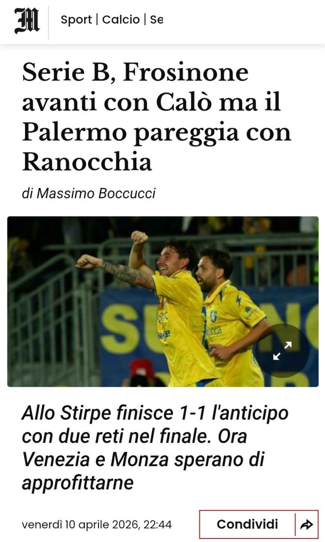 Finisce in parità l’atteso scontro al vertice tra Frosinone e Palermo allo Stirpe che ha aperto stasera (venerdì 10 aprile) la 34ª giornata in Serie B. L’1-1 ferma la striscia di successi delle due squadre (ciociari reduci da 3 vittorie e siciliani da 2) nel segno dei centrocampisti Calò a segno al 76’ per i padroni di casa e Ranocchia al 94’ per gli ospiti. Palermitani imbattuti nelle ultime 5 sfide, con un successo, contro i laziali. Di questo pareggio sperano di approfittare domani (sabato 11 aprile) la capolista Venezia, attesa a Chiavari dalla Virtus Entella, e il Monza che ospita il Bari e potrebbe agganciare la squadra di Massimiliano Alvini al 2° posto.
