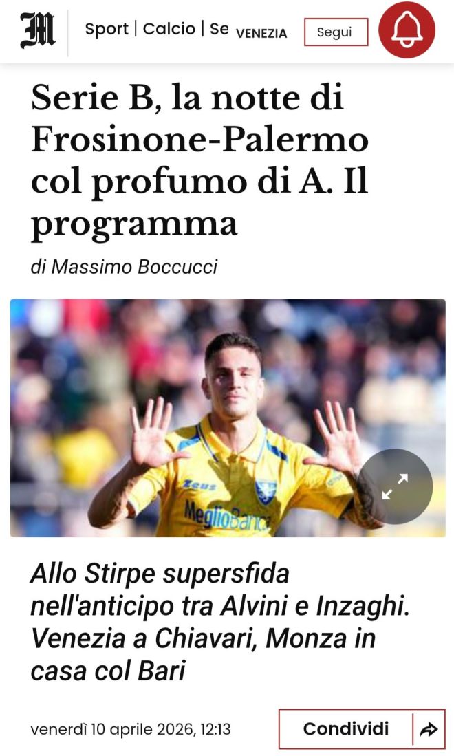 Una notte da Serie A allo Stirpe, con una fetta di promozione in ballo nella sfida tra Frosinone e Palermo che apre stasera (venerdì 10 aprile, ore 20.30) la 34ª giornata in B. A 5 giornate dalla fine della stagione regolare ci si gioca il salto di categoria senza passare per i playoff. Saranno spettatori interessati Giovanni Stroppa, perché il Venezia gioca domani a Chiavari contro la Virtus Entella in lotta per la salvezza, e Paolo Bianco, visto che il Monza riceve sempre domani il Bari che come i liguri lotta nei bassifondi della classifica. Massimiliano Alvini e Pippo Inzaghi non possono fare calcoli se guardano ai primi 2 posti.