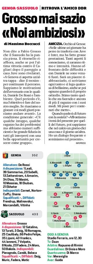 Non dite a Fabio Grosso che il Sassuolo ha la pancia piena. Il ritornello riaffiora, anche se poi l’ultima vittoria contro il Cagliari dopo il pareggio a casa Juve sono rivelatori. «A Genova ci aspetta un’altra tappa – dice il tecnico – per continuare il percorso. Sappiamo le motivazioni dell’avversario con le qualità, Daniele De Rossi e l’ambiente. Quel pericolo c’è, ma l’obiettivo è fare del nostro meglio. Se riusciamo a giocare coi modi giusti possiamo andare avanti». La condizione generale: «C’è qualche intoppo, qualche ragazzo ha dei problemini ma abbiamo numeri sufficienti e ho grande fiducia in tutti gli interpreti con una bella opportunità per crescere come gruppo».