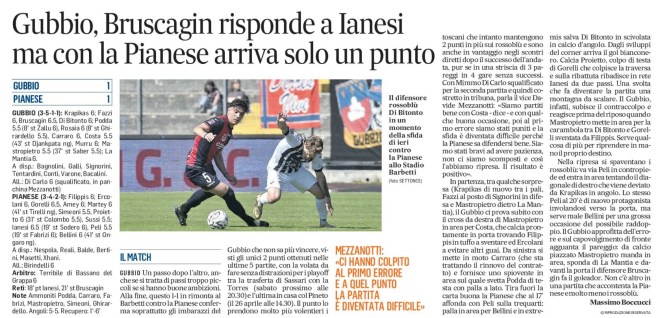 Nella ripresa si spaventano i rossoblù: va via Peli in contropiede ed entra in area tentando il diagonale di destro che viene deviato da Krapikas in angolo. Lo stesso Peli al 20′ è di nuovo protagonista involandosi verso la porta, ma serve male Bellini per una grossa occasione del possibile raddoppio. Il Gubbio approfitta dell’errore e sul capovolgimento di fronte agguanta il pareggio: da calcio piazzato Mastropietro manda in area, sponda di La Mantia e davanti la porta il difensore Bruscagin fa il goleador. Non c’è altro in una partita che accontenta la Pianese e molto meno i rossoblù.