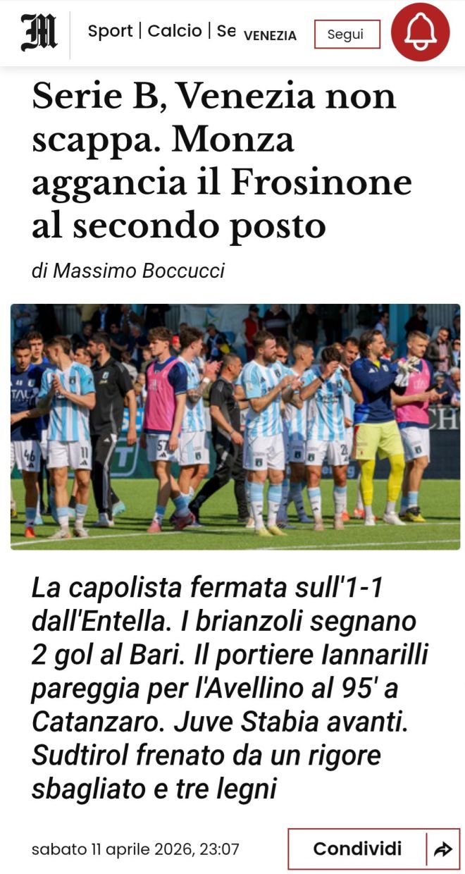 Non scappa il Venezia, fermato sul pareggio dalla Virtus Entella a Chiavari, e il Monza batte il Bari in casa agganciando il Frosinone al 2° posto in classifica vantando, a 4 giornate dalla fine, il vantaggio negli scontri diretti: questo ha detto il sabato della 34ª giornata in Serie B dopo l’1-1 allo Stirpe nell’anticipo del venerdì sera tra i ciociari e il Palermo. I lagunari si fanno rimontare: la sblocca subito Haps, poi nella ripresa Guiu si inventa un gran tiro dalla distanza. Gli ospiti chiudono in 10 uomini per il rosso diretto rimediato da Schingtienne, dopo che nel 1° tempo è stato annullato il raddoppio di Adorante per un fuorigioco millimetrico. I liguri di Andrea Chiappella sono appena fuori dalla zona playout.