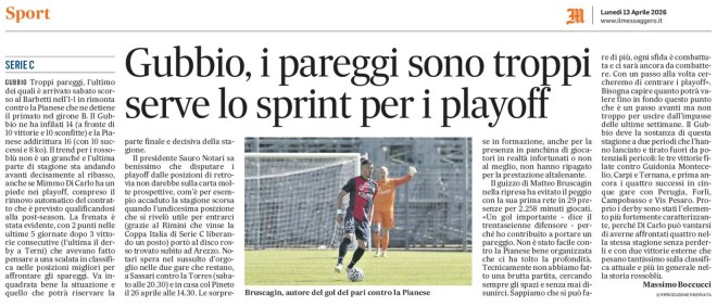 Il presidente Sauro Notari sa benissimo che disputare i playoff dalle posizioni di retrovia non darebbe sulla carta molte prospettive, com’è per esempio accaduto la stagione scorsa quando l’undicesima posizione che si rivelò utile per entrarci (grazie al Rimini che vinse la Coppa Italia di Serie C liberando un posto) portò al disco rosso trovato subito ad Arezzo. Notari spera nel sussulto d’orgoglio nelle due gare che restano, a Sassari contro la Torres (sabato alle 20.30) e in casa col Pineto il 26 aprile alle 14.30. Le sorprese in formazione, anche per la presenza in panchina di giocatori in realtà infortunati o non al meglio, non hanno ripagato per la prestazione altalenante. Il guizzo di Matteo Bruscagin nella ripresa ha evitato il peggio con la sua prima rete in 29 presenze per 2.258 minuti giocati. «Un gol importante – dice il trentaseienne difensore – perché ho contribuito a portare un pareggio. Non è stato facile contro la Pianese bene organizzata che ci ha tolto la profondità. Tecnicamente non abbiamo fatto una brutta partita, cercando sempre gli spazi e senza mai disunirci. Sappiamo che si può fare di più, ogni sfida è combattuta e ci sarà ancora da combattere. Con un passo alla volta cercheremo di centrare i playoff». Bisogna capire quanto potrà valere fino in fondo questo punto che è un passo avanti ma non troppo per uscire dall’impasse delle ultime settimane. Il Gubbio deve la sostanza di questa stagione a due periodi che l’hanno lanciato e tirato fuori da potenziali pericoli: le tre vittorie filate contro Guidonia Montecelio, Carpi e Ternana, e prima ancora i quattro successi in cinque gare con Perugia, Forlì, Campobasso e Vis Pesaro. Proprio i derby sono stati l’elemento più fortemente caratterizzante, perché Di Carlo può vantarsi di averne affrontati quattro nella stessa stagione senza perderli e con due vittorie esterne che pesano tantissimo sulla classifica attuale e più in generale nella storia rossoblù.