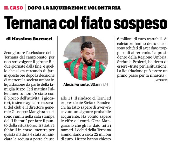 Scongiurare l’esclusione della Ternana dal campionato, per non stravolgere il girone B a due giornate dalla fine, è quello che si sta cercando di fare in queste ore dopo la decisione di mettere la società umbra in liquidazione da parte della famiglia Rizzo. Ieri mattina l’allenamento non c’è stato con il blocco dell’attività: i giocatori, insieme agli altri tesserati del club e il direttore generale Giuseppe Mangiarano, si sono riuniti nella sala stampa del “Liberati” per fare il punto della situazione. Trattative febbrili in corso, mentre per questa mattina è stata annunciata la seduta a porte chiuse alle 11. Il sindaco di Terni ed ex presidente Stefano Bandecchi ha fatto sapere di aver «ricevuto un signore probabile acquirente. Ha voluto sapere le cifre e i conti. C’era Mangiarano che gli ha dato tutti i numeri. I debiti della Ternana ammontano a circa 22 milioni di euro. I Rizzo hanno chiesto 6 milioni di euro trattabili. Ai calciatori hanno detto che si sono schifati di aver dato troppi soldi ai ternani». La presidente della Regione Umbria, Stefania Proietti, ha detto di essere «triste per la situazione. La liquidazione può essere un primo passo per la rinascita».
