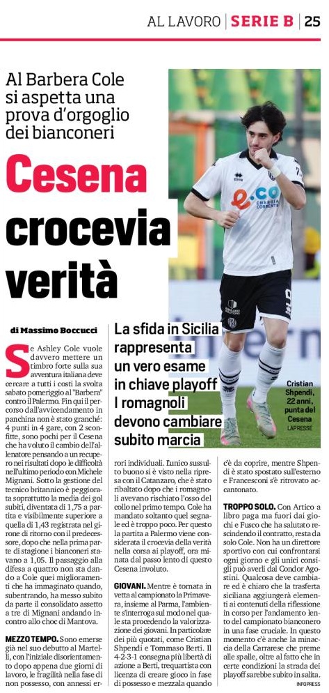 MEZZO TEMPO. Sono emerse già nel suo debutto al Martelli, con l’iniziale disorientamento dopo appena due giorni di lavoro, le fragilità nella fase di non possesso, con annessi errori individuali. L’unico sussulto buono si è visto nella ripresa con il Catanzaro, che è stato ribaltato dopo che i romagnoli avevano rischiato l’osso del collo nel primo tempo. Cole ha mandato soltanto quel segnale ed è troppo poco. Per questo la partita a Palermo viene considerata il crocevia della verità nella corsa ai playoff, ora minata dal passo lento di questo Cesena involuto.