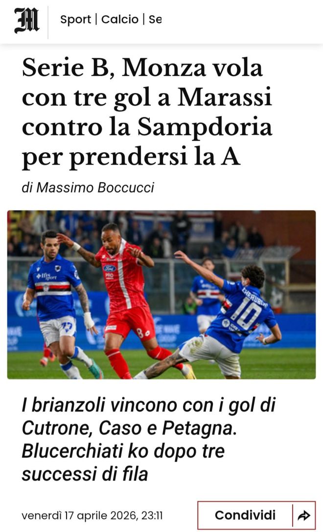 L’avvertimento del Monza è forte e chiarissimo nella corsa alla promozione diretta in Serie A visto che apre la 35ª giornata in B sbancando Marassi, nell’anticipo di venerdì 17 aprile, con un sonante 3-0 contro la Sampdoria per agganciare in testa il Venezia atteso oggi a Bari e staccando di 3 punti il Frosinone di scena sempre oggi a Modena. I brianzoli colgono il 2° successo consecutivo dopo 3 pareggi, mentre i liguri si fermano dopo 3 vittorie filate. Bastano i primi 13 minuti per ipotecare il colpo. Ci pensa Cutrone, al 4° gol, che sfrutta la torre di Delli Carri, poco dopo arriva il raddoppio grazie a un guizzo sempre di Cutrone per Caso che davanti a Martinelli non sbaglia realizzando la sua prima rete stagione. Chiude i giochi nel finale Petagna con l’8° gol che vale l’esultanza con maglia tolta e ammonizione inevitabile per festeggiare la via della rete ritrovata dopo un mese e dopo 2 assist nelle 2 gare precedenti.