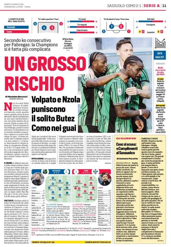 RIVOLUZIONE. Fabregas deve correre ai ripari, così al rientro ne cambia subito tre e sceglie il doppio centravanti con Douvikas accanto a Morata. Ridisegnare la squadra non scuote più di tanto, al di là del possesso (70%) e la vena di Nico Paz. Più pericoloso il Sassuolo che potrebbe far male di nuovo tra il tentativo di Volpato dopo una serie di finte con la risposta di Butez e Muharemovic che di testa manca la porta. Il risveglio dei lariani sta nella giocata di Da Cunha che da lontano trova il portiere (22’) e soprattutto a ruota da Nico Paz che, servito da Perrone, uncina il pallone verso Turati che superato dalla palla si tuffa e smanaccia via sulla linea (Morata in zona non interviene come potrebbe). Il Sassuolo chiude sfiorando il tris con Pinamonti. Manda alto dopo un pasticcio dei lariani che non sono proprio in serata.