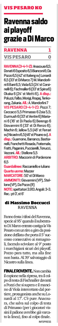 Fanno festa i tifosi del Ravenna, specie al 95’ quando il subentrato Di Marco entrato castiga la Vis Pesaro con un tiro a giro da posizione defilata che porta il 5° successo consecutivo ai romagnoli, facendo scivolare al 9° posto i marchigiani sicuri dei playoff. Pozzo para tutto, ma alla fine non basta. Al 39’ salvataggio di Nicastro sulla linea.