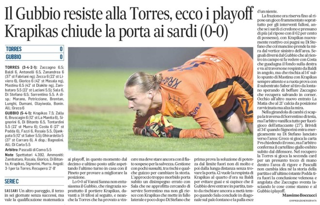 Nella girandola di cambi ci scappa la traversa di Sorrentino di testa, ma l’arbitro vanifica tutto per fuorigioco dell’attaccante (27’). Brividi al 34’ quando Signorini entra energicamente su Di Stefano lanciato verso l’area: Greco si gioca la carta Fvs chiedendo il rosso, ma l’arbitro conferma il cartellino giallo esibito subito dal difensore. Nel recupero la Torres si gioca la seconda card per un presunto tocco di mano dentro l’area di rigore e Pasculli non cambia idea né la storia della partita e all’ultimo istante Podda tira fuori la conclusione velenosa e angolata che Zaccagno sventa lasciando le cose come stanno e al Gubbio i playoff.
