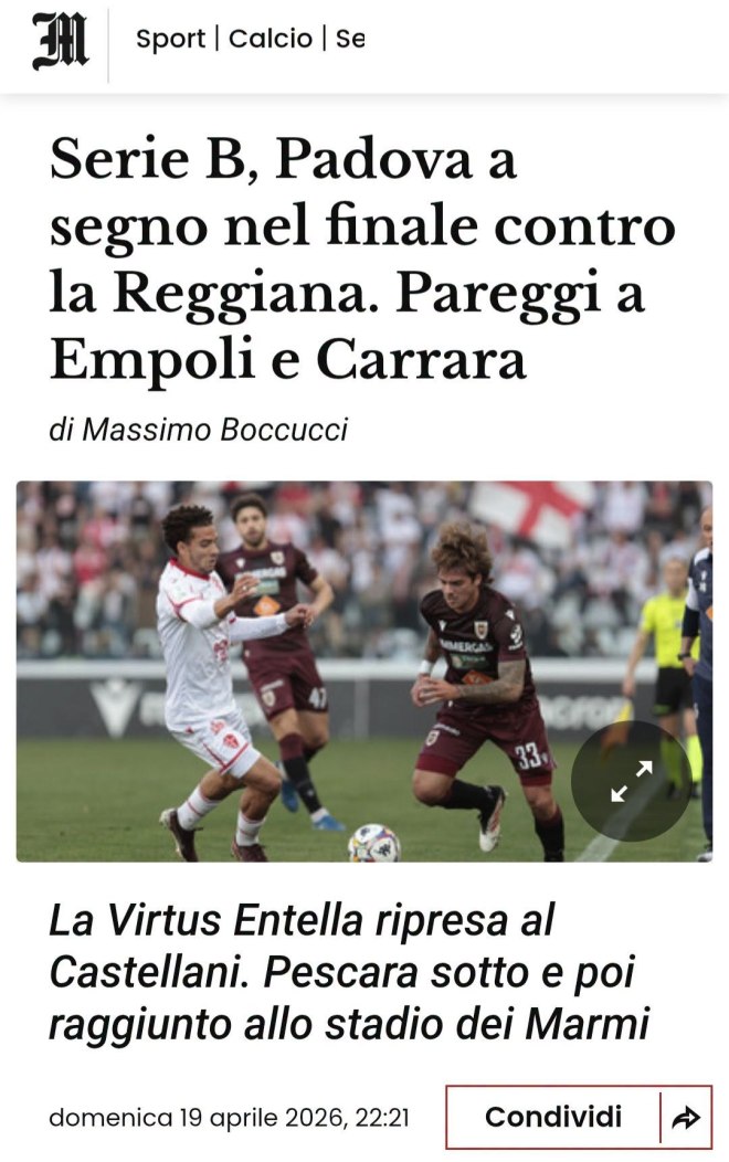 Tre sfide per la salvezza e anche per i playoff hanno caratterizzato la domenica che ha chiuso la 35ª giornata in Serie B. Vittoria pesante per il Padova, contro la Reggiana nel finale, e due pareggi a Empoli e Carrara, rispettivamente con Virtus Entella e Pescara, che lasciano aperti tanti giochi.