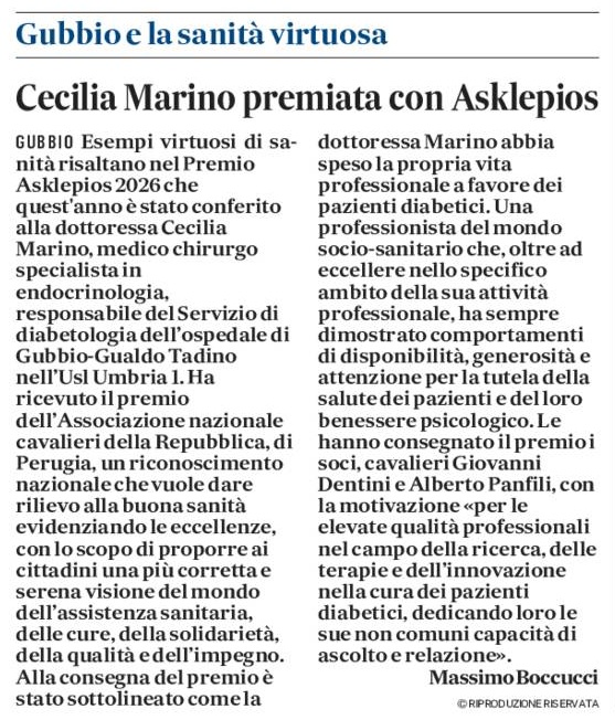 GUBBIO Esempi virtuosi di sanità risaltano nel Premio Asklepios 2026 che quest’anno è stato conferito alla dottoressa Cecilia Marino, medico chirurgo specialista in endocrinologia, responsabile del Servizio di diabetologia dell’ospedale di Gubbio-Gualdo Tadino nell’Usl Umbria 1. Ha ricevuto il premio dell’Associazione nazionale cavalieri della Repubblica, di Perugia, un riconoscimento nazionale che vuole dare rilievo alla buona sanità evidenziando le eccellenze, con lo scopo di proporre ai cittadini una più corretta e serena visione del mondo dell’assistenza sanitaria, delle cure, della solidarietà, della qualità e dell’impegno. Alla consegna del premio è stato sottolineato come la dottoressa Marino abbia speso la propria vita professionale a favore dei pazienti diabetici. Una professionista del mondo socio-sanitario che, oltre ad eccellere nello specifico ambito della sua attività professionale, ha sempre dimostrato comportamenti di disponibilità, generosità e attenzione per la tutela della salute dei pazienti e del loro benessere psicologico. Le hanno consegnato il premio i soci, cavalieri Giovanni Dentini e Alberto Panfili, con la motivazione «per le elevate qualità professionali nel campo della ricerca, delle terapie e dell’innovazione nella cura dei pazienti diabetici, dedicando loro le sue non comuni capacità di ascolto e relazione».