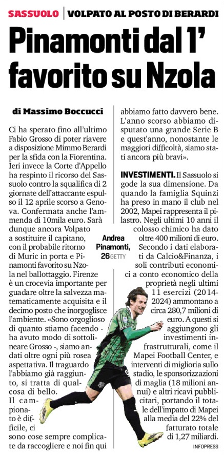 Ci ha sperato fino all’ultimo Fabio Grosso di poter riavere a disposizione Mimmo Berardi per la sfida con la Fiorentina. Ieri invece la Corte d’Appello ha respinto il ricorso del Sassuolo contro la squalifica di 2 giornate dell’attaccante espulso il 12 aprile scorso a Genova. Confermata anche l’ammenda di 10mila euro. Sarà dunque ancora Volpato a sostituire il capitano, con il probabile ritorno di Muric in porta e Pinamonti favorito su Nzola nel ballottaggio. Firenze è un crocevia importante per guadare oltre la salvezza matematicamente acquisita e il decimo posto che inorgoglisce l’ambiente. «Sono orgoglioso di quanto stiamo facendo – ha avuto modo di sottolineare Grosso -, siamo andati oltre ogni più rosea aspettativa. Il traguardo l’abbiamo già raggiunto, si tratta di qualcosa di bello. Il campionato è difficile, ci sono cose sempre complicate da raccogliere e noi fin qui abbiamo fatto davvero bene. L’anno scorso abbiamo disputato una grande Serie B e quest’anno, nonostante le maggiori difficoltà, siamo stati ancora più bravi».