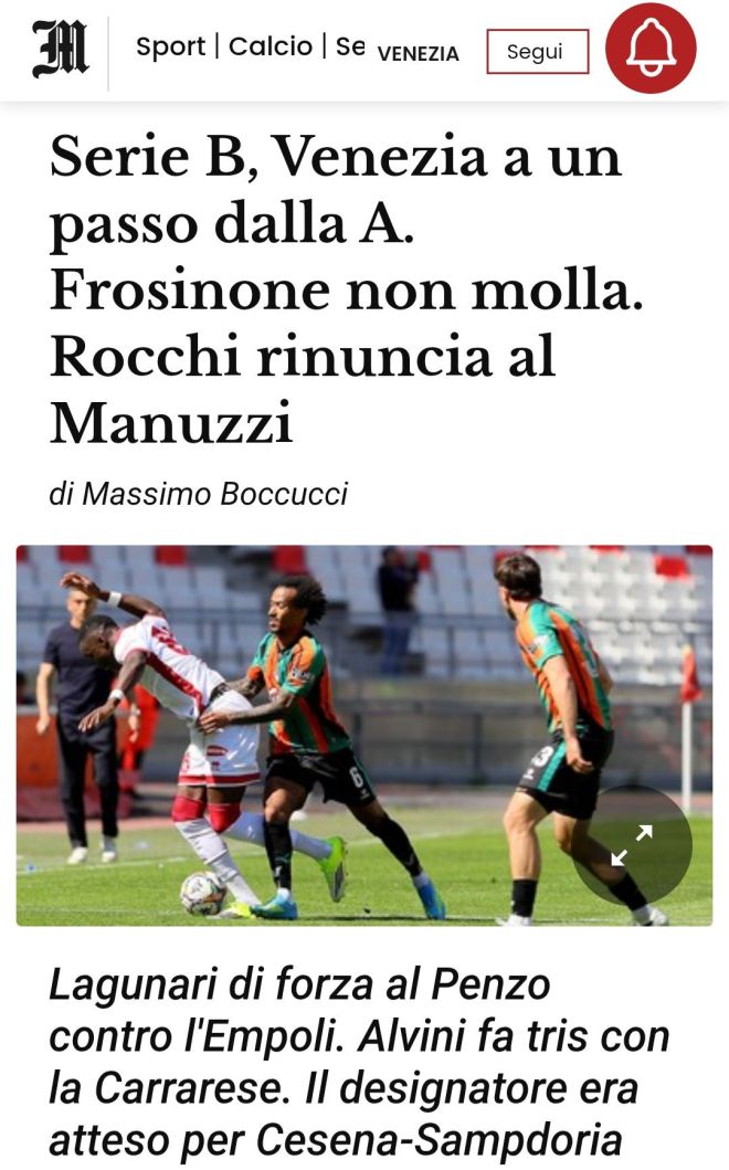 Venezia e Frosinone tirano dritti, rispondendo al Monza nel sabato della 36ª giornata che proietta la Serie B verso gli ultimi 180 minuti della stagione regolare con i verdetti tutti in ballo. I brianzoli avevano fatto la loro parte nell’anticipo di ieri sera (venerdì 24 aprile), quando hanno battuto 1-0 il Modena, mentre oggi hanno vinto i lagunari nel fortino del Penzo contro l’Empoli con il cecchino Adorante e i ciociari contro la Carrarese travolta per 3-0. Promozione matematica rinviata per la capolista: gli uomini di Giovanni Stroppa avrebbero potuto festeggiare il ritorno in A soltanto in caso di ko del Frosinone. Contro i toscani stappa la gara Adorante al 50’: azione velocissima dei veneti, Doumbia apre per Franjic e il croato va al cross di prima, vedendo sbucare tra i difensori avversari l’attaccante che di testa non perdona per raggiungere quota 17 gol, di cui 2 consecutivi e 4 in altrettante giornate. Giochi chiusi all’87’ da Doumbia. Tutto nasce da un contropiede con l’inserimento di Compagnon che dribbla e serve bene il compagno sulla sinistra per il piattone che non dà scampo a Fulignati.