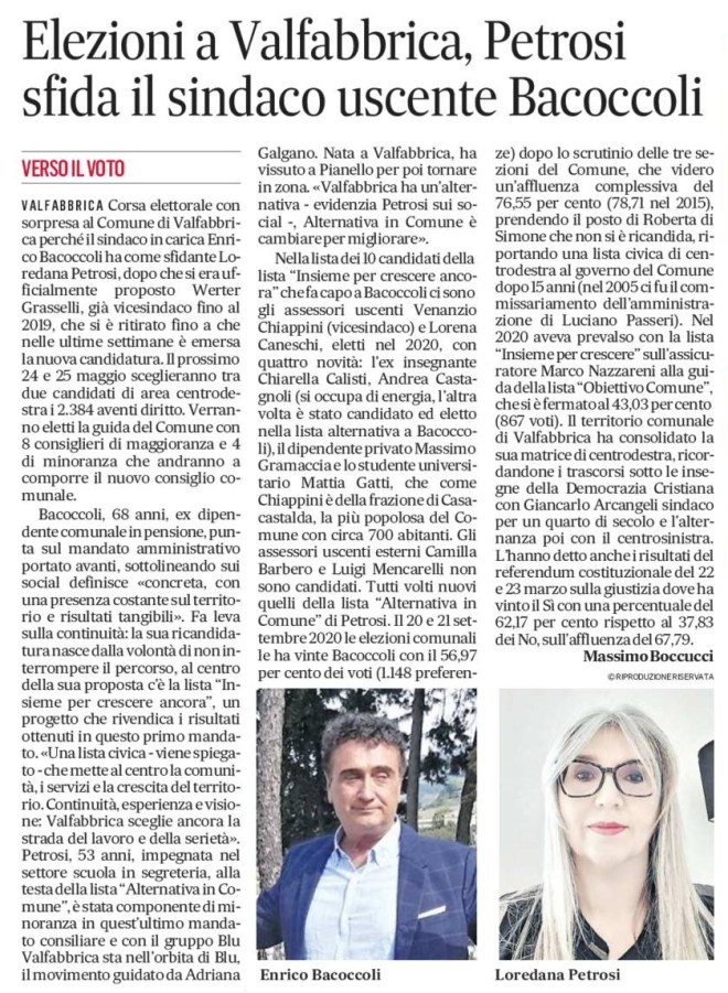 VALFABBRICA Corsa elettorale con sorpresa al Comune di Valfabbrica perché il sindaco in carica Enrico Bacoccoli ha come sfidante Loredana Petrosi, dopo che si era ufficialmente proposto Werter Grasselli, già vicesindaco fino al 2019, che si è ritirato fino a che nelle ultime settimane è emersa la nuova candidatura. Il prossimo 24 e 25 maggio sceglieranno tra due candidati di area centrodestra i 2.384 aventi diritto. Verranno eletti la guida del Comune con 8 consiglieri di maggioranza e 4 di minoranza che andranno a comporre il nuovo consiglio comunale.