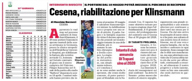 Approntata la road map nel percorso sanitario di Jonathan Klinsmann, il 29 enne portiere bianconero operato martedì della scorsa settimana in Germania, presso la clinica ortopedica dell’Heidelberg University Hospital, per stabilizzare la frattura alla vertebra cervicale C1, lesionata nel fortuito contrasto di gioco con il centrocampista del Palermo Filippo Ranocchia nel finale della partita allo stadio “Barbera” disputata lo scorso 18 aprile. I sanitari tedeschi hanno previsto che intorno al prossimo 10 maggio il calciatore bianconero potrà iniziare la riabilitazione vera e propria con una serie di attività. Il padre Jurgen e la famiglia seguono da vicino il decorso operatorio che procede nel monitoraggio costante in una delle cliniche più rinomate in ambito chirurgico a livello europeo. La stagione del portiere statunitense, con cittadinanza tedesca, si è conclusa e se ne sono andate anche le speranze, che erano molto concrete, di poter partecipare al Mondiale con la Nazionale Usa. Il ragazzo ha come obiettivo tornare per la nuova stagione dopo l’ufficializzazione, il 15 gennaio scorso, del prolungamento del contratto con il Cesena fino al 30 giugno del 2028.