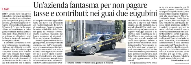 L’organizzazione poteva contare su una vera e propria rete di venditori porta a porta dell’illecito: in pratica agenti di zona, pure loro iscritti nel registro degli indagati, che operavano in Umbria, Lombardia, Veneto, Emilia Romagna, Toscana, Marche e Puglia. Il loro compito era individuare imprese clienti interessate a ridurre i costi del personale, operanti in settori ad alta intensità di manodopera come la ristorazione, le attività ricettive, i servizi di pulizia, l’edilizia e lo spettacolo. Oltre ai risvolti penali, l’operazione ha innescato immediati provvedimenti amministrativi. È stata inoltrata segnalazione all’Agenzia delle entrate per chiedere la chiusura della partita Iva della ditta e della società di Gubbio utilizzate come schermo per gli illeciti. Contestualmente, la Procura valuterà l’applicazione delle sanzioni.